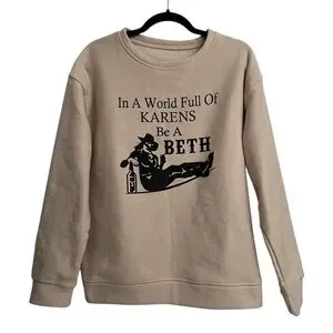 Creamy Beige Taupe unisex sweatshirt with the graphic text "In A World Full Of KARENS Be A BETH". The design is inspired by the character Beth Dutton from the TV series Yellowstone. Size Medium. Approx measurements: armpit to armpit 22.5”, length 25.5”.