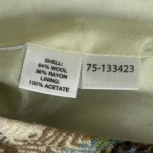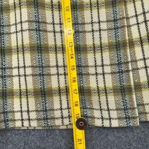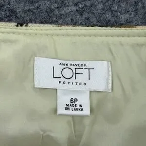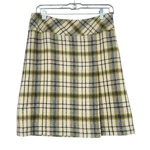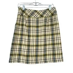 Ann Taylor Loft Petites wool blend mini skirt features a classic plaid pattern in shades of cream, olive green, and blue. Crafted with a structured wool-rayon shell and fully lined with smooth acetate, this A-line piece offers both warmth and a polished silhouette. The design includes a subtle wrap-style front panel and a clean waistband, making it a versatile choice for professional or academic setting.