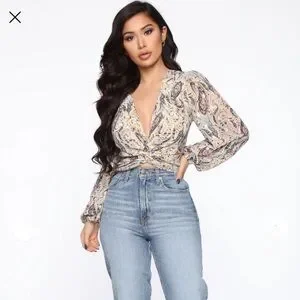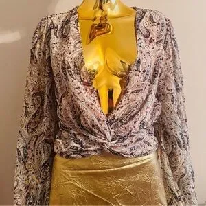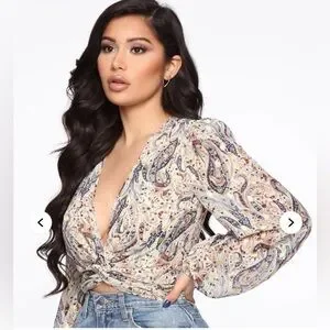 Elevate your style with this chic paisley print twist front blouse. Perfect for any occasion, this top features a flattering design and elegant cream tones. Pair it with your favorite jeans for a sophisticated look.