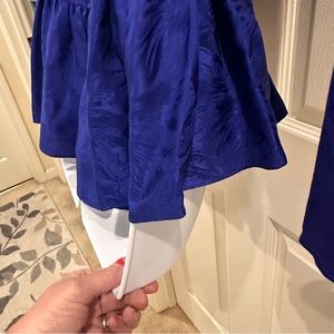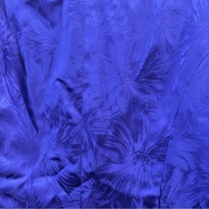 Holy moly. This silk blouse is OUTSTANDING. 1990s. Blue silk with a tone on tone floral design. Shoulder pads, if you hate them, clip them out. Dynasty and Dallas vibes for sure. Super elegant. Silk covered buttons. Flute / flounce on bottom. Fitted. No stretch. The blue is a jewel tone for sure!