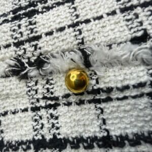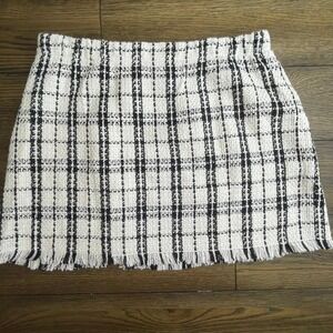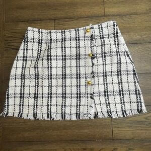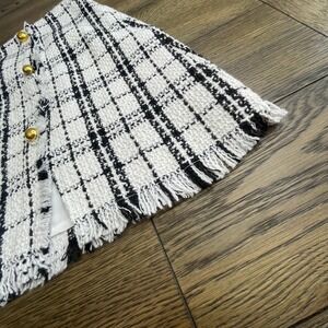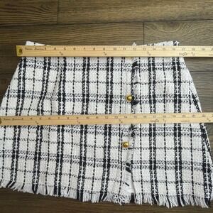 Kate Kasin tweed mini skirt in black and white plaid, size XL, new with tags. Button-front style with frayed hem and gold-tone buttons. Textured tweed fabric.
