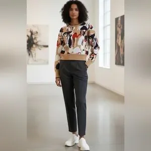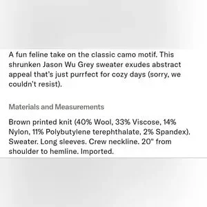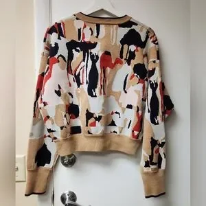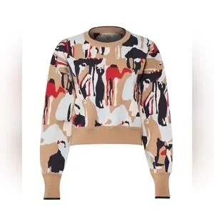 Make a sophisticated statement with this iconic GREY Jason Wu intarsia knit pullover. This isn't just a sweater—it’s a piece of wearable art. Featuring a striking abstract camel motif in a high-contrast palette of tan, ivory, black, and a pop of red on the harness.