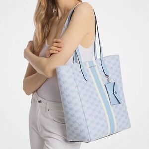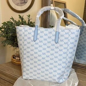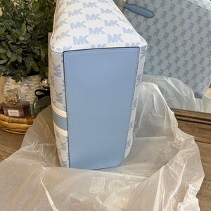 Stylish tote bag in light blue with white accents. Perfect for daily use. Features signature Michael Kors design. Card case included.