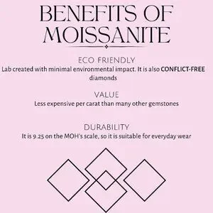 Moissanite tests as a diamond on the thermal diamond tester and is the most BRILLIANT gemstone. It has a hardness score of 9.25 on the MOH’s scale for hardness, and more durability than sapphire, ruby, or emerald. Diamond scores a 10 in comparison.