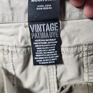 Labels and logos: Small exterior Kuhl logo tab on the front pocket; interior waistband label with Kuhl mountain shield logo and size 40; interior care and fabric-content labels listing the vintage patina dye treatment and wash instructions.