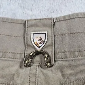 Features: Zip fly with top button closure, belt loops around the waistband, front slash hand pockets, right front coin pocket with small Kuhl logo tab, side cargo pocket at the leg, articulated seams for ease of movement, stretch fabric blend for comfort, and straight hem openings with approximately knee-length 10 inch inseam design.