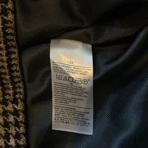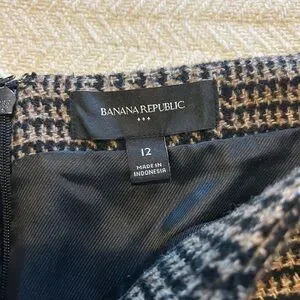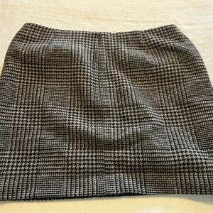 Banana Republic houndstooth mini skirt in black and tan. Features subtle textured weave. Clean lines and classic pattern. Versatile for dressy or casual looks.