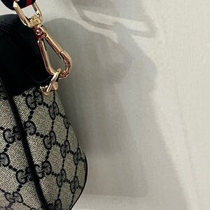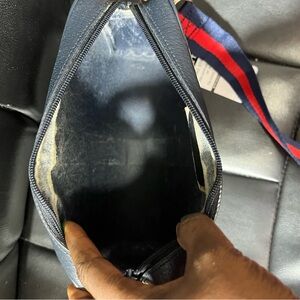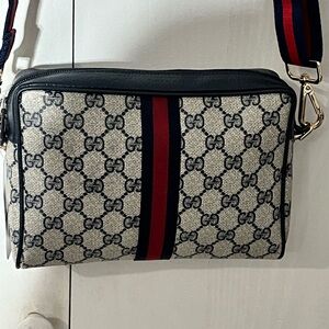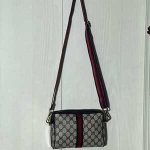 Gucci Beige GG Canvas clutch, converted into Crossbody with Navy and Red Stripe