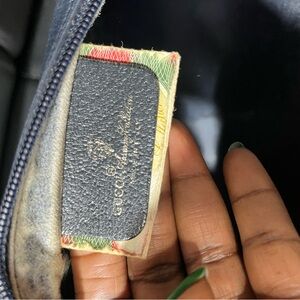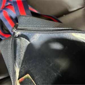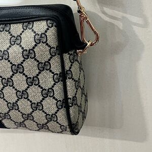 Gucci clutch in signature GG canvas. Navy and red web stripe down center. Navy leather trim.