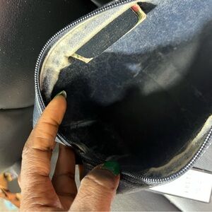 This clutch has been converted into a crossbody using an after market d-ring and adjustable striped strap. Compact rectangular silhouette for hands-free wear.