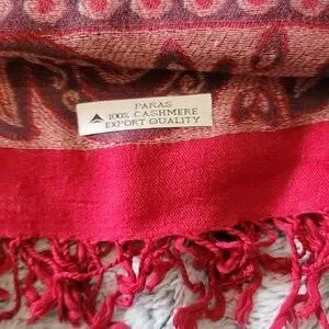 Elegant red scarf featuring a paisley pattern and fringe detail. Perfect for adding a pop of color to any outfit.