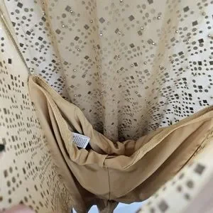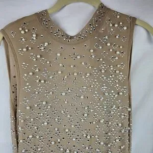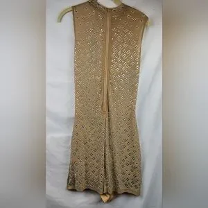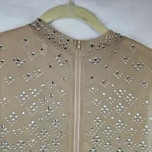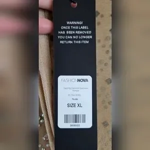 The Fashion Nova Bejeweled Nylon Romper in XL is a glamorous one-piece outfit perfect for cocktail parties and New Year's celebrations. This sexy romper features a high neckline, zip closure, and is made from mesh fabric adorned with beads and sequins, giving it a festive and eye-catching look. Designed for a comfortable fit with lining and stretch, this romper is ideal for summer, fall, and spring events. The beige color and Barbie-inspired character make this romper a statement piece for any party wardrobe. Hand wash only to maintain its quality, this romper from Fashion Nova is sure to turn heads and make a stylish statement.