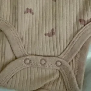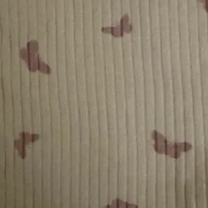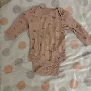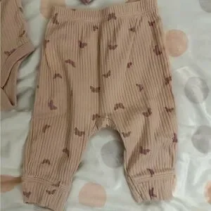 Soft ribbed long-sleeve bodysuit with snap closure. Matching ribbed pants with elastic waist. Blush color with small butterfly mauve prints. Cozy and simple set. Great everyday outfit.