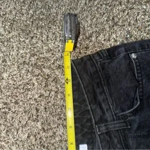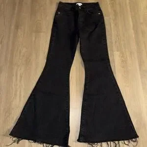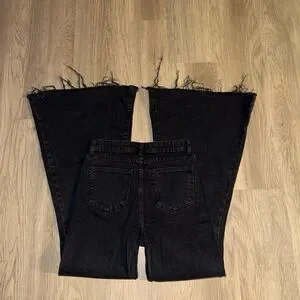 Chic black wide leg jeans with a flared silhouette. Features a stylish frayed hem.