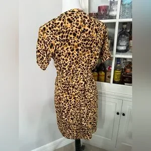 Chic animal print dress with a wrap design. Features a V-neck and short sleeves. Ideal for versatile styling.