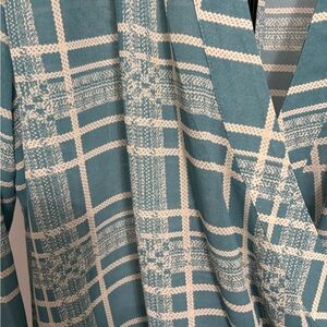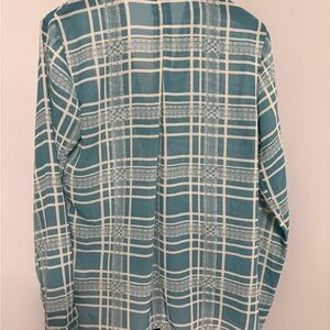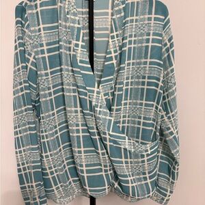 CAbi Windowpane Faux Wrap Blouse Teal Blue Cream Plaid Chiffon Boho Office #3068