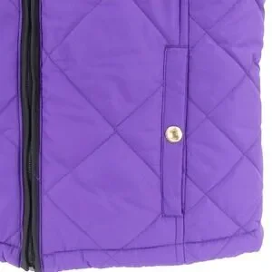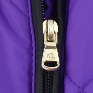 A stylish and versatile quilted vest from Lauren Ralph Lauren. This purple vest features a full zip front with branded gold-tone zipper pull, a stand-up collar, and a sleeveless design. It also has two front pockets with snap closures, adding both functionality and style.