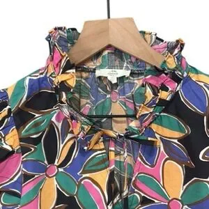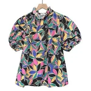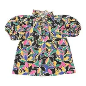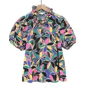 Entro Vibrant Floral Print Short Puff Sleeve Tiered Detail Top Size Medium