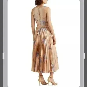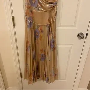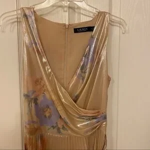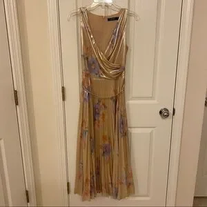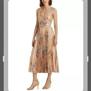 New with tag. Cut from luxe metallic crepe, Lauren Ralph Lauren's breezy calf-skirting dress is designed with a pleated skirt and a flattering surplice neckline. With a nod to the coastal equestrian lifestyle of Santa Barbara, this dress features a rhinestone-embellished horseshoe-shaped buckled belt and a feminine floral pattern in shades of blush and sage, which draw inspiration from the arid landscape of the West Coast.