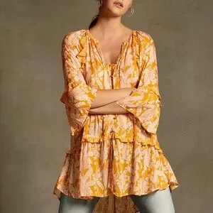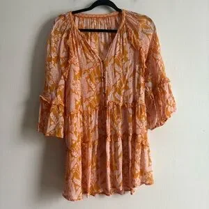 Anthropologie Sz M Mia Bohemian Semi-Sheer Printed Blouse Tunic. Features a lightweight flowy fabric, vibrant boho-inspired print, and feminine flutter long sleeves. Relaxed, airy silhouette perfect for layering or effortless everyday styling.