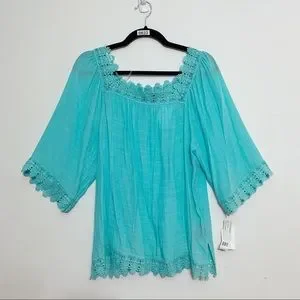 Zac & Rachel Turquoise Lace Trim Peasant Blouse Boho NWT Medium
