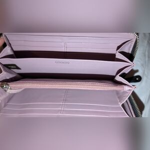 Sleek croc-embossed leather exterior. Zip-around closure secures contents. Silver-tone Coach logo plaque adds shine. Classic black finish for versatile style.