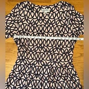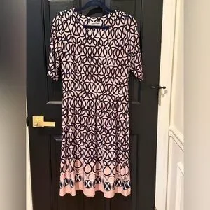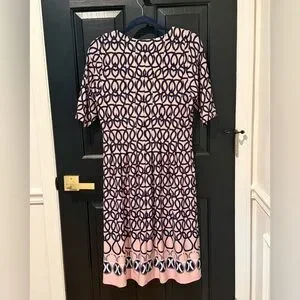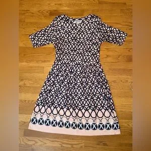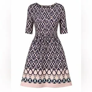 Pink dress with bold navy interlocking circle pattern. Round neckline and short sleeves. Flattering silhouette with decorative border hem. Lightweight and wearable for day or evening.