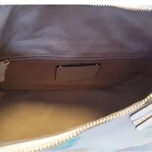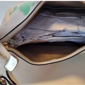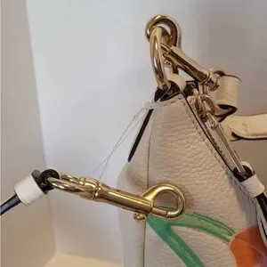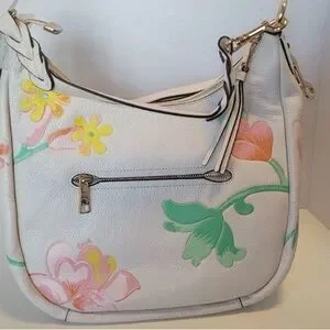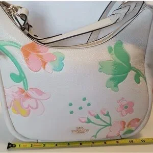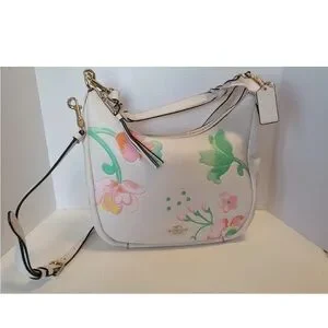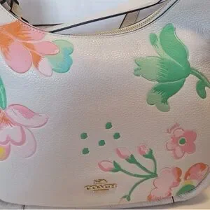 Beautiful Coach New York pebbled leather bag in white with soft pastel floral print and gold-tone hardware. Features a curved silhouette with both a shoulder strap and detachable crossbody strap for versatile wear.