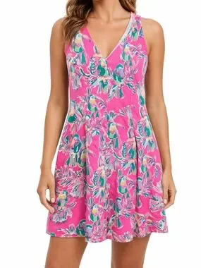 Turn heads in this vibrant and iconic Lilly Pulitzer dress featuring a bold tropical print in bright pink with playful pops of green, blue, and yellow. This flattering A-line silhouette is perfect for warm weather, vacations, brunch, or everyday chic.