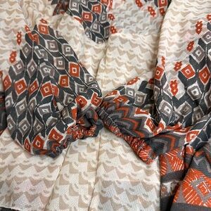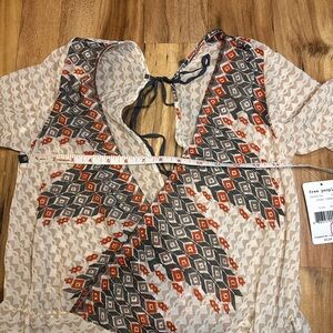 New with tags Free People boho mini dress in the “Ivory Combo” colorway. Features a flattering V-neckline with tie detail, sheer lightweight fabric, and mixed geometric/tribal-inspired print throughout.