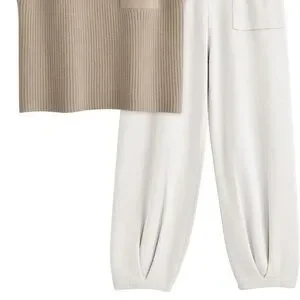 Relaxed knit sleeveless top paired with wide-leg pull-on pants. Soft neutral tones for easy layering. Clean pockets and minimalist styling. Versatile for casual or refined outfits.