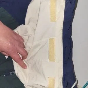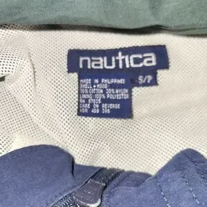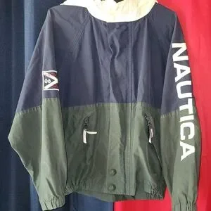 Nautica colorblock windbreaker. Navy top with forest green lower panels. Full zip with front pockets. Bold Nautica logo on sleeve. Lightweight, sporty design.