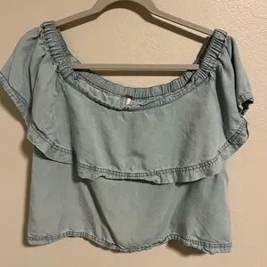 Light pale blue off-the-shoulder crop top with a soft ruffle overlay. Elasticized neckline for easy wear. Casual, breezy style perfect for warm days. Pairs well with high-waist denim or skirts.