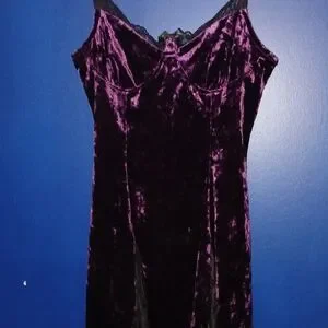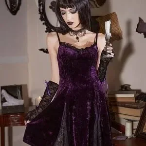 Velvet mini dress with lace trim. Spaghetti straps and fitted bodice. Flared skirt with layered details. Gothic-inspired silhouette. Rich deep purple color.