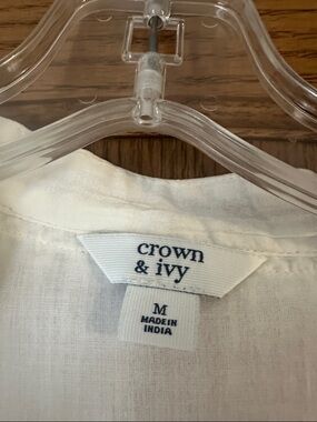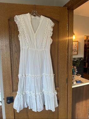 Lightweight white midi dress with textured crinkle fabric. V-neckline and flutter cap sleeves. Pom-pom and ruffle trim accent tiers. Fitted waist for a flattering shape.
