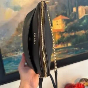 Compact crossbody in smooth black leather. Gold-tone chain and leather strap combo. Front Furla logo accent. Zip top closure for secure carry. Clean, versatile style for day or night.