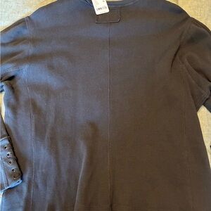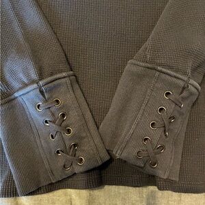 Thermal top with drop sleeves, subtle ruching detail at shoulders and lacing detail at cuffs. Distressed black/dark, dark gray color. Brand NWT. Stock photos to show fit.