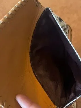 This unique handbag features a striking combination of cowhide and leather with intricate floral embossing. The fringe detailing and chain strap add a bohemian touch, making it a standout accessory.