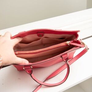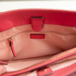 A charming Kate Spade New York satchel handbag in a vibrant "Flamingo Pink" color. This versatile bag features a textured leather exterior with an intricate laser-cut floral pattern on the front pocket. It includes dual top handles for carrying and a detachable crossbody strap for hands-free convenience. The interior offers multiple compartments to keep your essentials organized. This is in great preowned condition with some general wear, such as dirty spots. Please review pictures for condition. Such a fun bag for the warmer months!