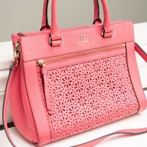Keywords: Kate Spade, satchel, crossbody, coral, leather, laser cut, floral, structured, day bag, evening bag, designer, summer, spring, fashion