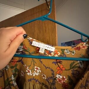 Flowy mustard maxi dress with short sleeves. Floral print in green, purple, red, and white. Smocked waist for a flattering silhouette. Lightweight fabric with gentle drape.