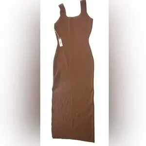Elevate your wardrobe with this chic brown midi dress. Featuring a stylish side slit, it's perfect for any occasion. Super comfy body con knit dress with square neckline. Size medium New with tags