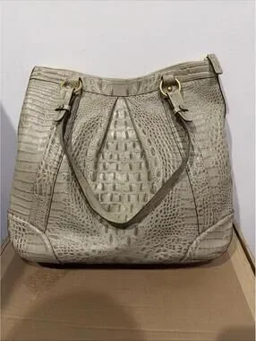 Beautiful Brahmin shoulder bag in croc-embossed leather with classic neutral tone and gold-tone hardware. The exterior still presents nicely with a structured shape and signature texture.