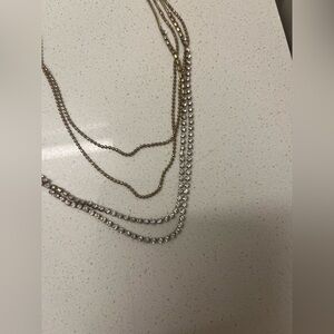 Chic Talbots layered necklace set in warm gold tone. Multiple delicate chains with mixed bead and bezel accents. Sparkling round crystals add subtle shine. Versatile look that layers beautifully over casual or dressy tops.