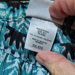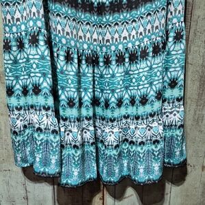 Flowing maxi skirt with a tiered hem. Elastic waist for comfortable wear. Teal and black geometric stripe pattern. Lightweight fabric with good movement.