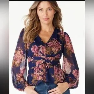 Bright red floral-print V-neck peplum top with long sleeves. Lightweight, flattering fit with a cinched waist and tie detail. Vibrant red adds a bold, feminine touch to any outfit.