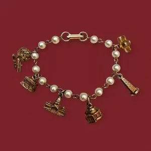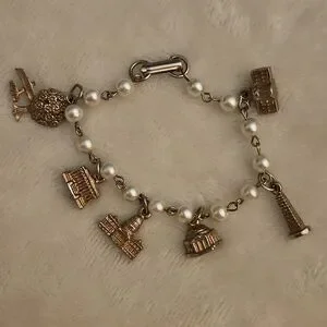 Elegant silver and pearl charm bracelet featuring iconic landmarks. Perfect for adding a touch of sophistication to any outfit.