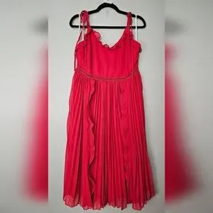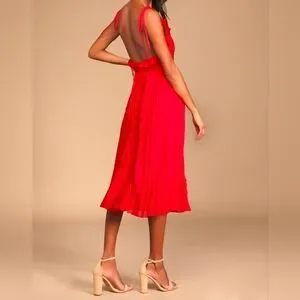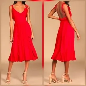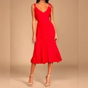 Lulus Never a Dull Moment Bright Red Tie-Strap Pleated Midi Dress, Size XL