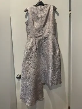 This elegant sleeveless cocktail dress by Rickie Freeman for Teri Jon features a shimmering silver metallic brocade fabric with a beautiful textured, abstract pattern that catches the light beautifully.