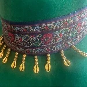 Stylish emerald green wide brim fedora by San Diego Hat Company. Features a patterned fabric band and gold-tone dangling beads. Soft felt finish and structured crown. Elegant, boho-inspired look.